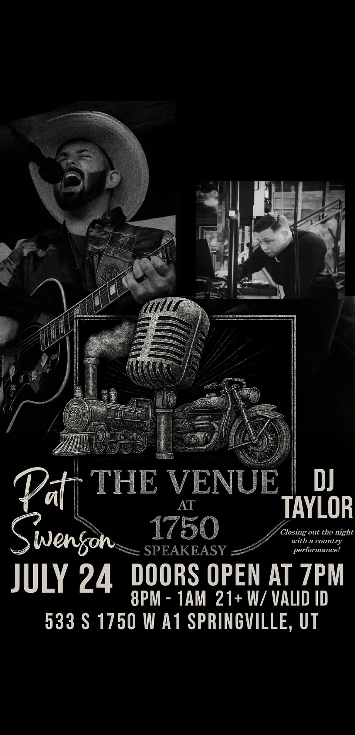 Join us at The Venue at 1750 on July 24, 2025, for a high-energy Pioneer Day celebration with country artist Pat Swenson! Hailing from Spanish Fork, Pat brings his signature blend of heartfelt lyrics and powerful stage presence, having shared the spotlight with country greats like Darryl Worley and Thompson Square.